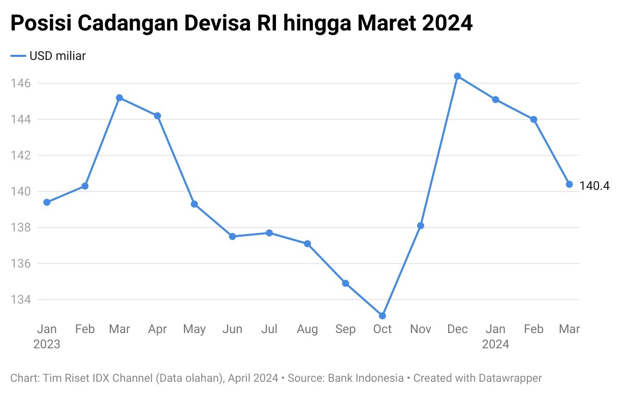 Posisi cadangan devisa (cadev) Indonesia pada akhir Maret 2024 juga menyusut menjadi USD140,4 miliar dibanding posisi pada akhir Februari 2024 sebesar USD144,0 miliar.