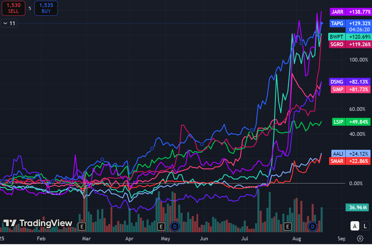 Berdasarkan data Bursa Efek Indonesia (BEI), saham PT Jhonlin Agro Raya Tbk (JARR) menjadi jawara dengan kenaikan 138,77 persen YtD. Disusul Triputra Agro Persada (TAPG) yang naik 129,32 persen, serta Eagle High Plantations (BWPT) yang melesat 120,69 persen. Kinerja tak kalah solid juga dicatatkan Sampoerna Agro (SGRO) dengan reli 119,26 persen.