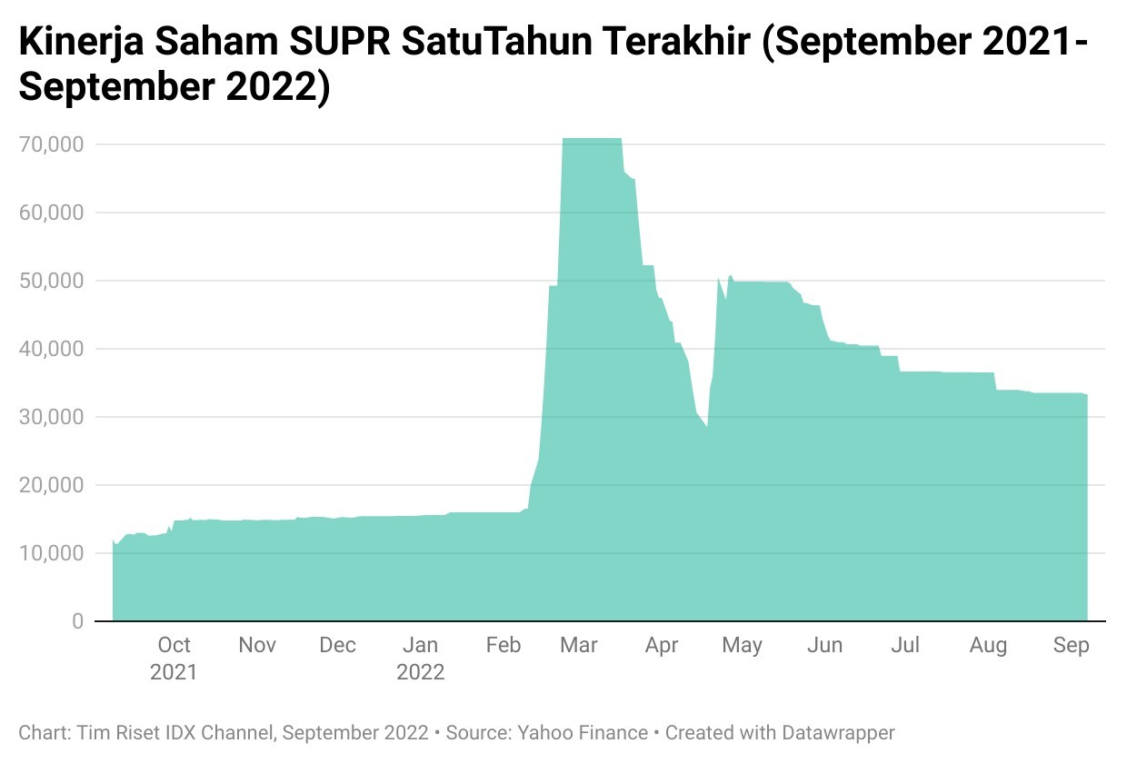 Berdasarkan data Bursa Efek Indonesia (BEI) per penutupan Kamis (8/9), saham SUPR terbang 115,51 persen secara year to date (ytd).