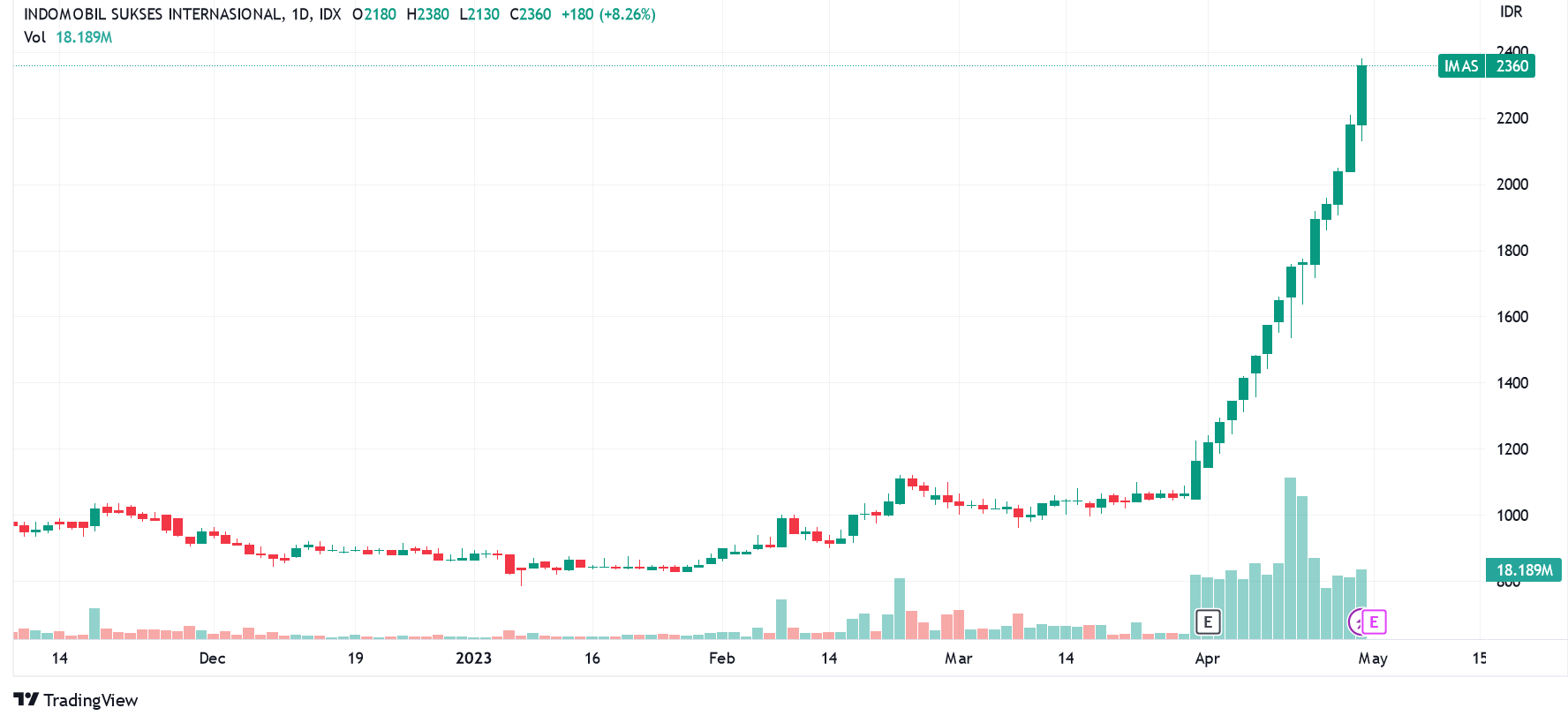 Ini menggenapi reli kenaikan saham IMAS sejak 30 Maret lalu atau nyaris satu bulan kalender perdagangan, termasuk libur Idulfitri 19-25 April.