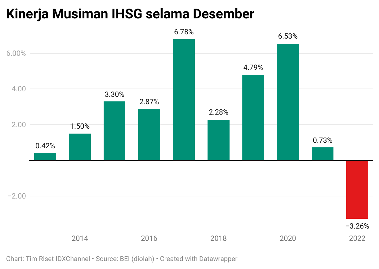 Selama 2013-2022 atau 10 tahun terakhir, Indeks Harga Saham Gabungan (IHSG) berhasil menghijau 9 kali selama Desember dan hanya memerah sekali, yakni pada 2022, menjadi bulan terbaik di pasar saham RI. (Lihat grafik di bawah ini.)