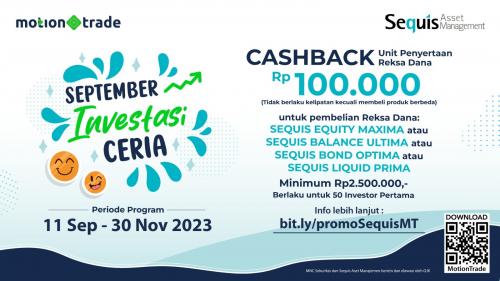 Investor dapat memenangkan cashback unit penyertaan reksa dana senilai Rp100.000 (seratus ribu rupiah) dengan melakukan pembelian salah satu produk reksa dana dari PT Sequis Aset Manajemen yaitu Reksa Dana Sequis Equity Maxima atau Reksa Dana Sequis Balance Ultima atau Reksa Dana Sequis Bond Optima atau Reksa Dana Sequis Liquid Prima dengan akumulasi selama periode program minimum Rp2.500.000 (dua juta lima ratus ribu rupiah) melalui aplikasi MotionTrade.