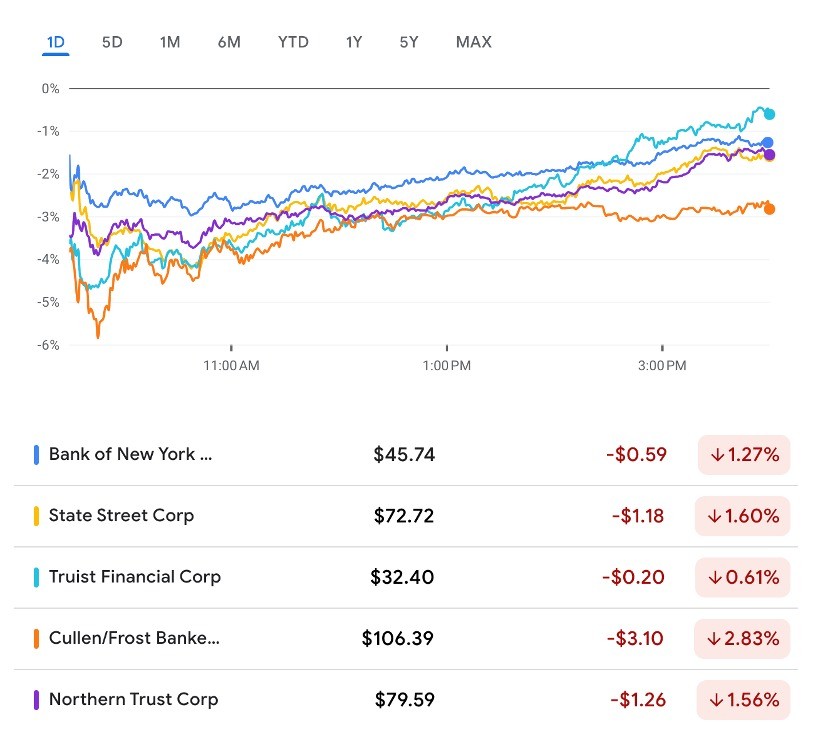 Ada 10 bank besar di AS yang mengalami penurunan peringkat kredit, yakni M&T Bank (MTB), Webster Bank (WBS), Pinnacle Financial Partners (PNFP), BOK Financial Corp. (BOKF), Associated Banc-Corp. (ASB), Old National Bancorp (ONB), Amarillo National Bank, Commerce Bancshares (CBSH), Prosperity Bank (PB), dan Fulton Financial Corp. (FULT).