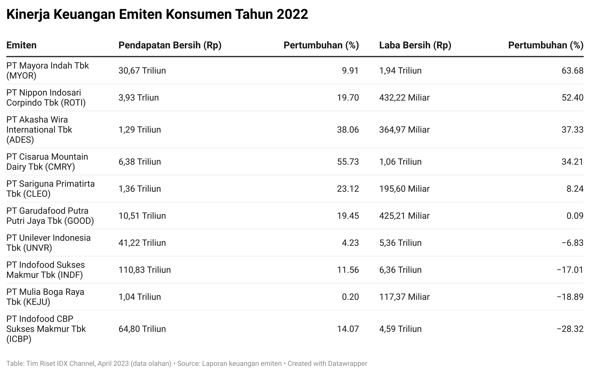 IDXChannel – Sejumlah emiten konsumen telah melaporkan keuangannya pada 2022 lalu. Tercatat, PT Mayora Indah Tbk (MYOR) hingga PT Cisarua Mountain Dairy Tbk (CMRY) mencetak kinerja termoncer di periode ini.