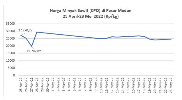 Badan Pengawas Perdagangan Berjangka Komoditi (Bappebti) mencatat harga CPO di Pasar Spot Medan sebelum diberlakukan larangan ekspor turun sebesar 22 persen menjadi Rp19.787,02/kg pada 27 April.
