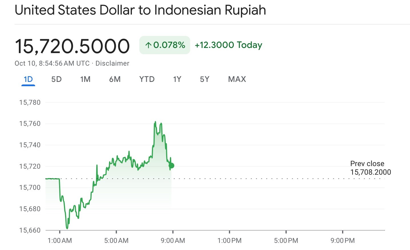 IDXChannel - Rupiah kembali melemah pada Selasa (10/10/2023) di level Rp15.728 per dolar Amerika Serikat (AS). Tren pelemahan rupiah berlanjut imbas sejumlah sentimen makro yang membuat dolar AS yang masih perkasa.