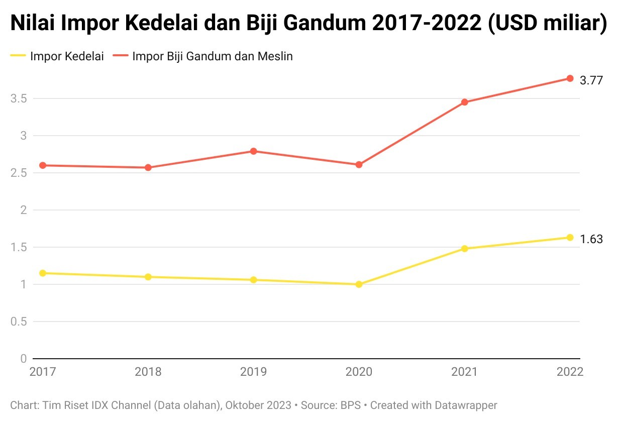 Tak hanya kedelai, nilai impor biji gandum dan meslin yang merupakan bahan baku industri makanan seperti mi instan juga meningkat sepanjang 2021 hingga 2022. Tercatat, tahun lalu nilai impor biji gandum dan meslin mencapai USD3,77 miliar. Meningkat 9,3 persen dibanding tahun sebelumnya sebesar USD 3,45 miliar.