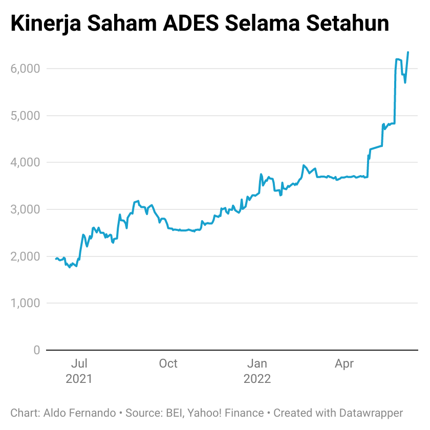 Harga saham ADES mulai melompat tajam setidaknya sejak 26 April 2022 ketika melesat 12,47% dan diikuti oleh volume yang tinggi sebesar 1,31 juta saham hari itu. Investor kala itu membeli saham ADES untuk mengapresiasi rilis kinerja keuangan 2021 yang dipublikasikan di hari yang sama.