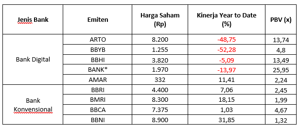 Berdasarkan data Bursa Efek Indonesia (BEI), bila ditinjau dari kinerja Year to Date (YTD), performa saham bank digital masih memerah. Tercatat empat emiten memiliki kinerja saham YTD yang negatif, yakni ARTO, BBYB, BBHI, dan BANK.