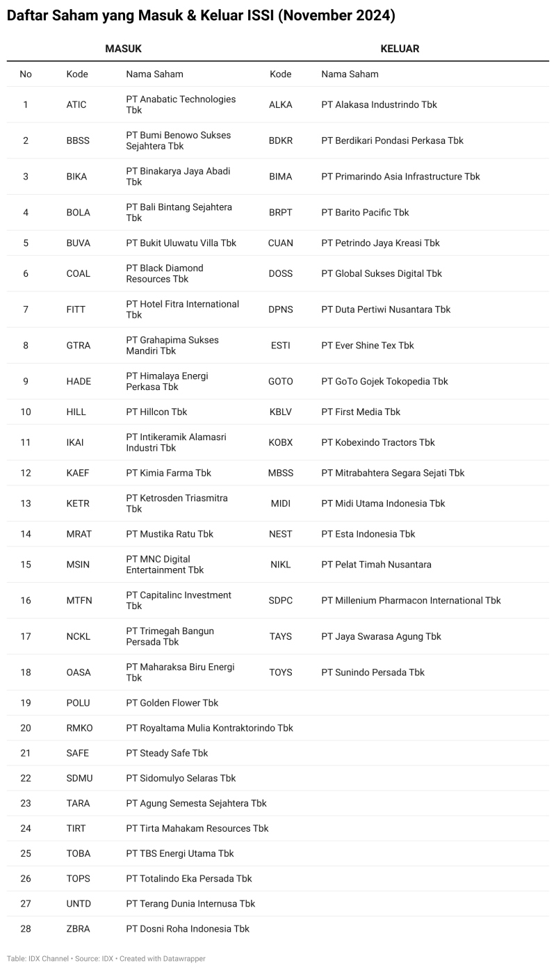 Untuk JII, Bursa juga melakukan kocok ulang atas indeks yang berisikan 30 saham syariah dengan likuiditas tertinggi di BEI. Selain GOTO dan BRPT, BEI juga mengeluarkan saham PT Indo Tambangraya Megah Tbk (ITMG) dari JII.