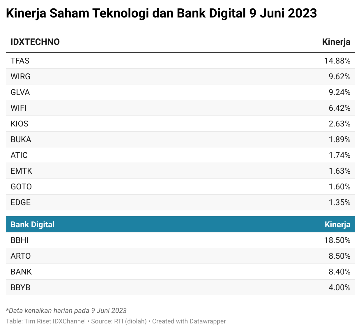 Setali tiga uang, sejumlah saham bank digital utama, yang memiliki korelasi positif dengan saham tech, juga kembali ‘berpesta’. Saham PT Allo Bank Indonesia Tbk (BBHI) melesat 18,50 persen, melanjutkan kenaikan menjadi 5 hari berturut-turut. (Lihat tabel di bawah ini.)