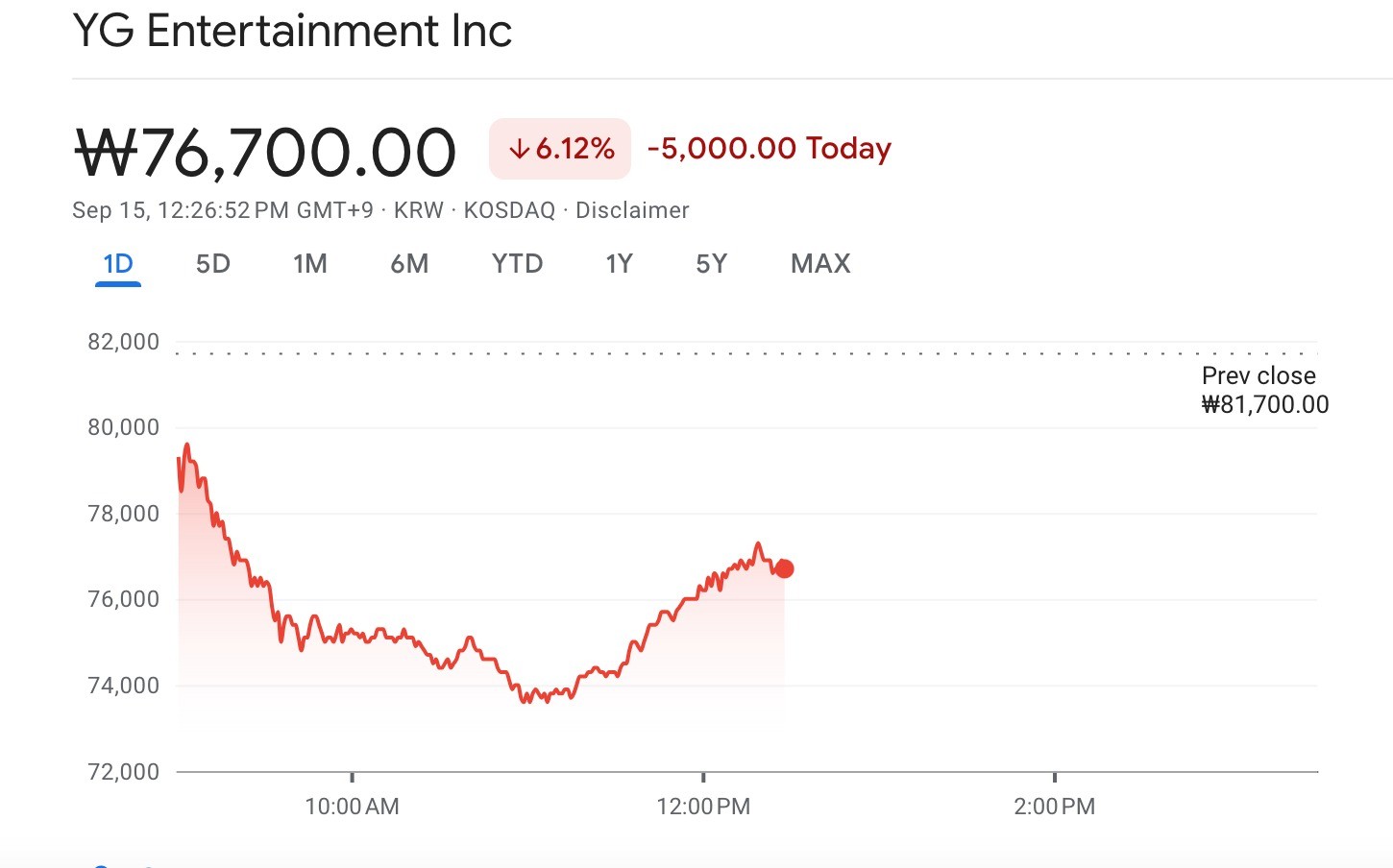 Jatuhnya harga saham tersebut merupakan penurunan satu hari terbesar YG sejak 28 September 2022. Per pukul 10.46 WIB, penurunan saham YG Entertainment menjadi sebesar 6,12 persen. (Lihat grafik di bawah ini.)