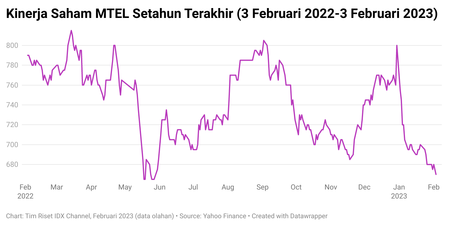 Sementara, dalam setahun belakangan, saham MTEL juga turun sebesar 16,25 persen. (Lihat grafik di bawah ini.)