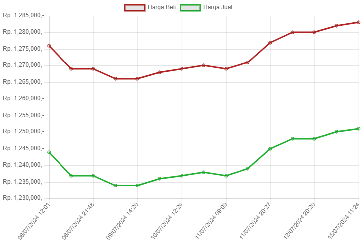 Harga beli emas dalam beberapa waktu terakhir cenderung mengalami kenaikan yang statis. Terlihat pada grafik di atas, harga beli emas terakhir berada di kisaran Rp1.284.000. Sedangkan, harga jualnya pada 15 Juli 2024 berada di kisaran Rp1.252.000.