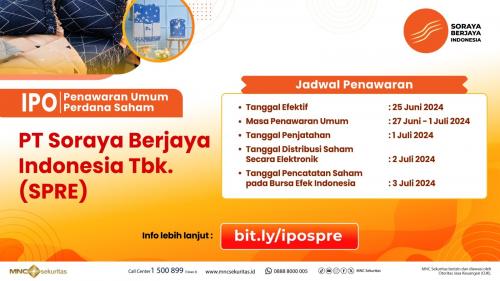 IDXChannel - PT Soraya Berjaya Indonesia Tbk (SPRE) mulai hari ini mulai melakukan Penawaran Umum Perdana Saham (IPO). Perseroan resmi menunjuk MNC Sekuritas sebagai Penjamin Pelaksana Emisi Efek.