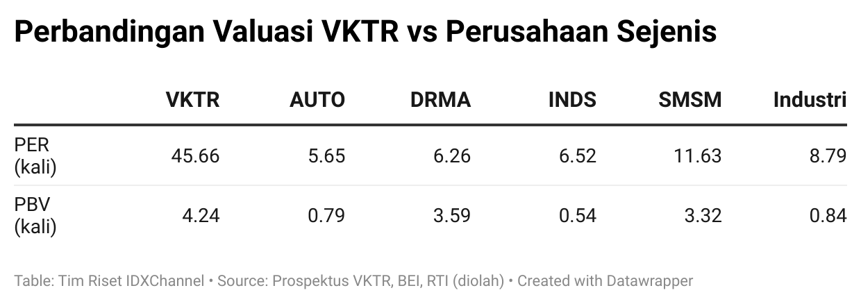 Dengan laba per saham (EPS) yang hanya Rp2,19 dan berpatokan pada harga IPO Rp100 per saham, rasio price-to earnings (PE atau PER) VKTR mencapai 45,66 kali.