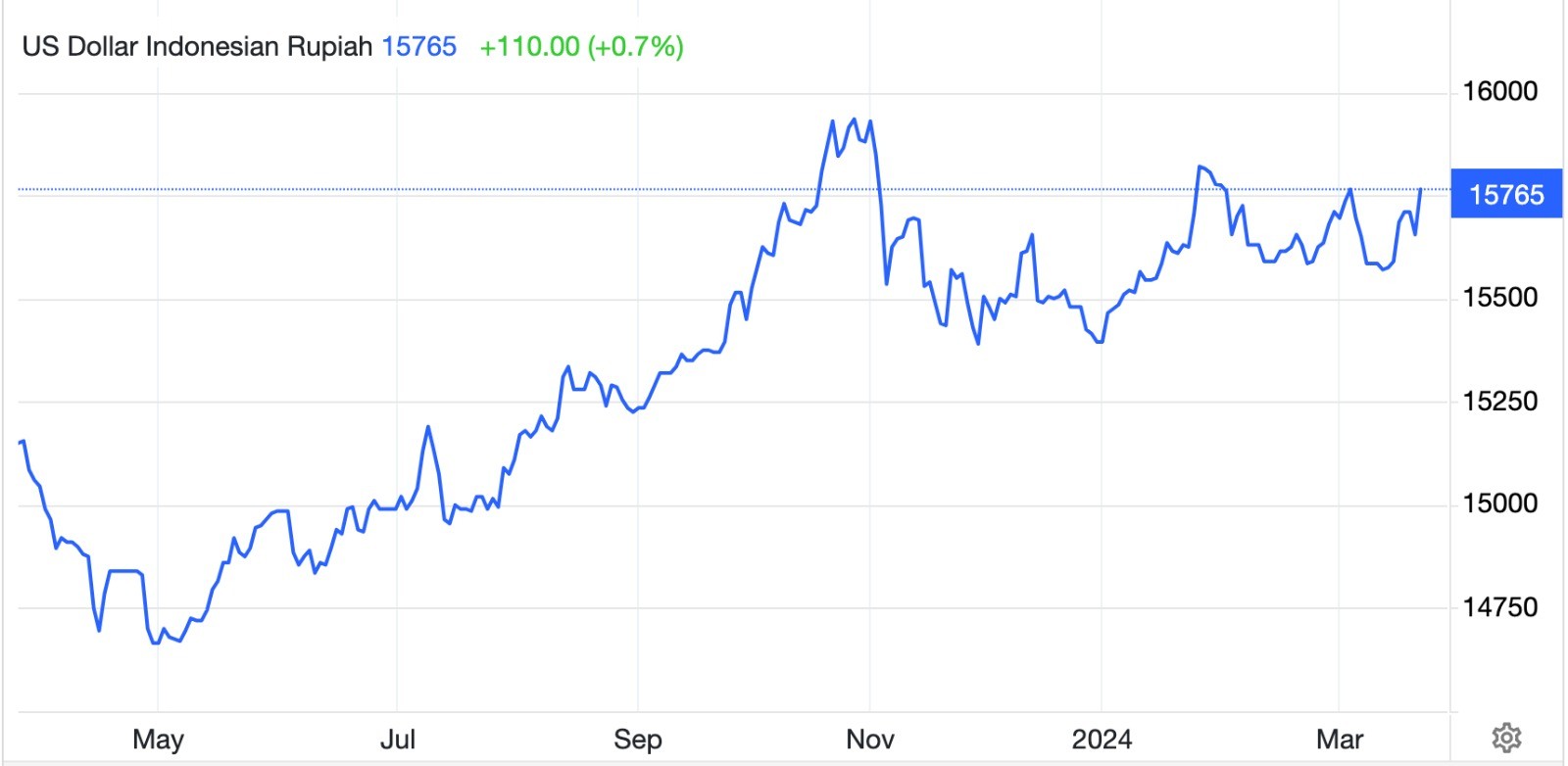 Per pukul 09.30 WIB, rupiah berada di posisi Rp15.765 per dolar AS, melemah 0,7 persen berdasarkan data Trading Economics. (Lihat grafik di bawah ini.)