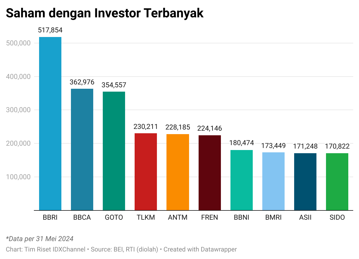 Praktis, BBRI kini menduduki peringkat pertama emiten dengan investor terbanyak, mengalahkan emiten bank swasta Grup Djarum PT Bank Central Asia Tbk (BBCA) yang dikuasai 362.976 pemegang saham atau raksasa teknologi PT GoTo Gojek Tokopedia Tbk (GOTO) dengan 354.557 investor. (Lihat tabel di bawah ini.)