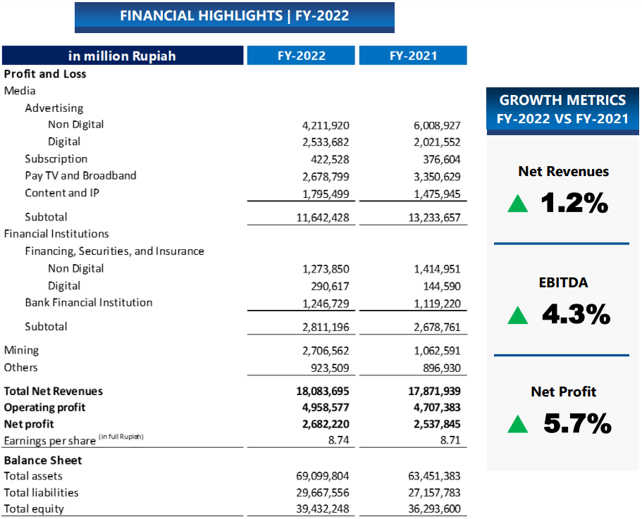 EBITDA Perseroan menguat 4,3%, dari Rp6.420,2 miliar menjadi Rp6.696,1 miliar di 2022, meningkatkan laba bersih menjadi Rp2.682,2 miliar dari Rp2.537,8 miliar di 2021, atau setara dengan 5,7% yoy. Margin EBITDA dan margin laba bersih Perseroan masing-masing tercatat sebesar 37,0% dan 14,8%, membaik dibandingkan tahun 2021.