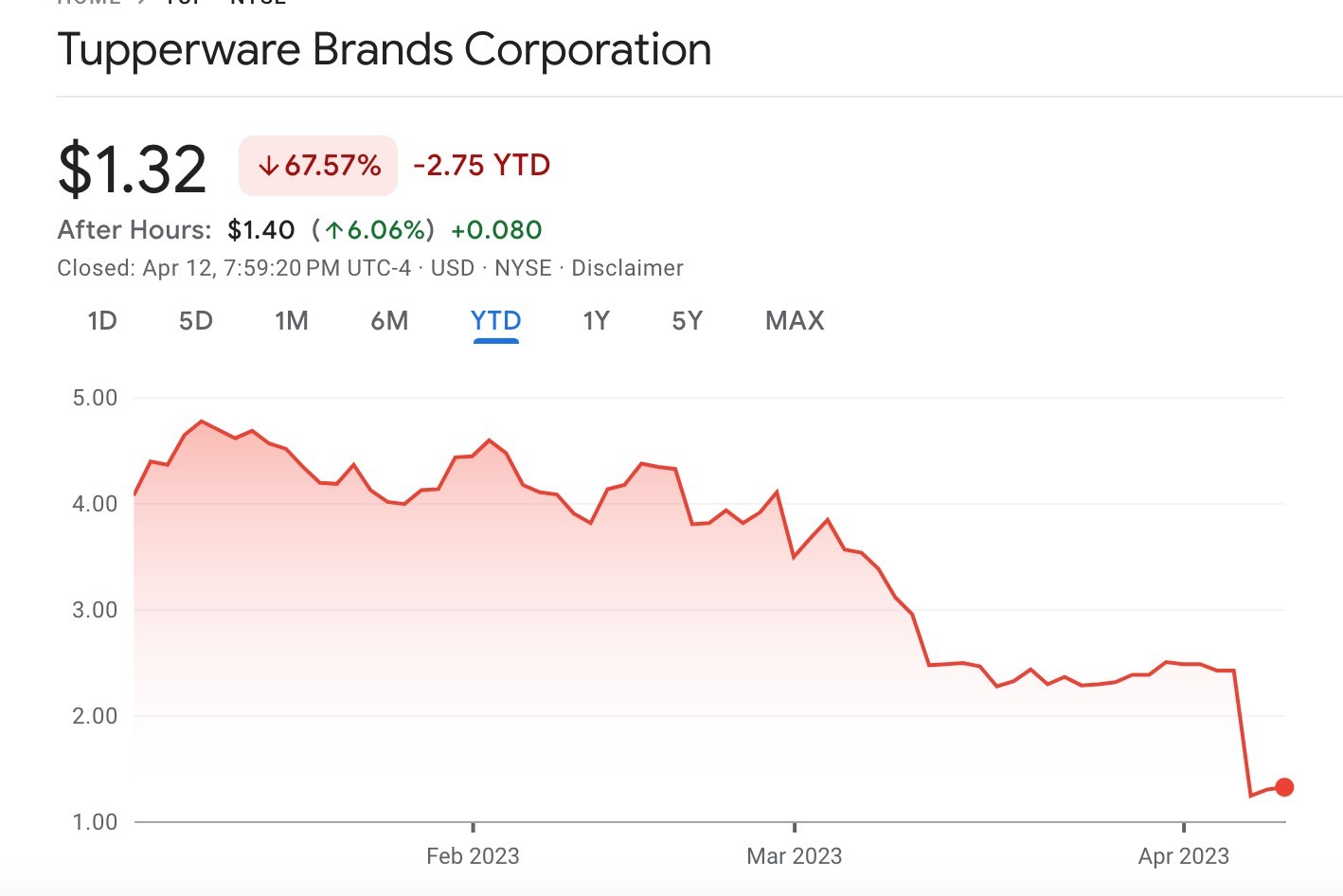 Adapun saham Tupperware Brands Corporation secara year to date (ytd) anjlok 67,57%. (Lihat grafik di bawah ini.)