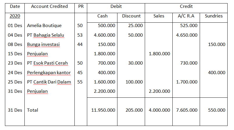 - Account credited, kolom/akun/transaksi yang dikreditkan dan nanti akan dicatat keterangannya dari setiap judul akun penerimaan