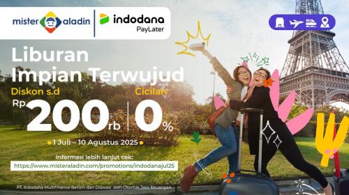 Saat ini, Mister Aladin bersama Indodana menawarkan promo spesial berupa voucher diskon s.d Rp200.000 dan cicilan 0%. Voucher ini dapat Anda manfaatkan untuk pemesanan hotel, tiket pesawat, tiket kereta, tur, hingga berbagai aktivitas seru lainnya dan dapat dipakai untuk periode perjalanan kapan pun.