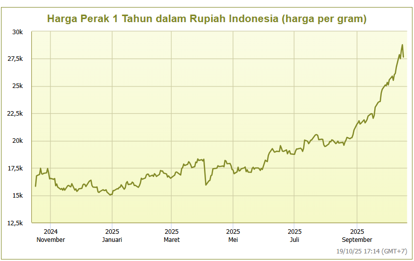 Pada 17 Oktober 2024 harga perak dibanderol Rp15.818 per gram. Sementara pada 17 Oktober 2025 harga perak sudah mencapai Rp27.656 per gram. Perak sempat menyentuh harga tertinggi sepanjang 2025 di level Rp28.782 per gram pada Kamis 16 Oktober kemarin.