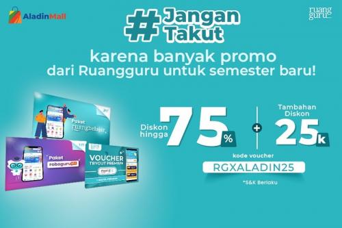 Selain itu, mumpung lagi ada Promo Ruangguru dengan diskon hingga 75% dan tambahan diskon Rp25.000 dengan minimal transaksi Rp150.000 yang hanya berlaku di AladinMall.id.