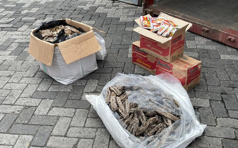 "Hasil pemeriksaan fisik menemukan sebanyak 99 karton sisik hewan dalam keadaan kering dengan berbagai macam ukuran dengan total berat 3.053 kg, teripang sebanyak 51 bag dengan berat total 1.530 gram, dan mie instan sebanyak 300 karton dengan berat total 1.200 kg serta 1 piece barang yang menyerupai potongan kayu," kata Adhang dalam konferensi pers di Jakarta, Rabu (4/3/2026).