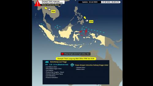 “Dalam 24 jam ke depan, Bibit Siklon Tropis 99W berpeluang rendah menjadi siklon tropis dan bergerak ke arah Barat-Barat Laut,” tulis BMKG dalam keterangan resminya, Selasa (16/7/2024).