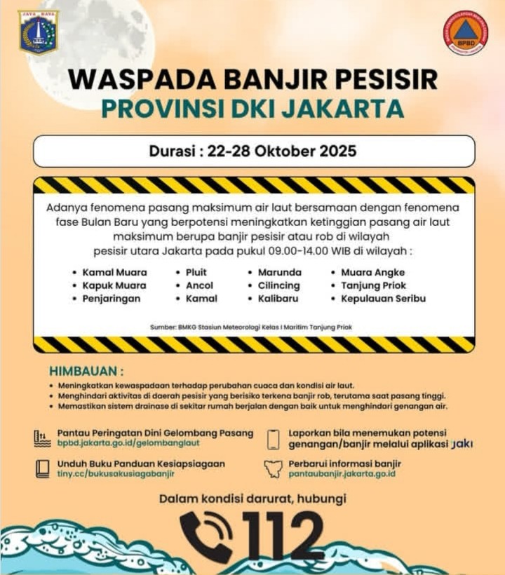 "Waspada banjir pesisir, 22-28 Oktober," tulis laman Instagram @bpbddkijakarta dikutip, Kamis (23/10/2025).
