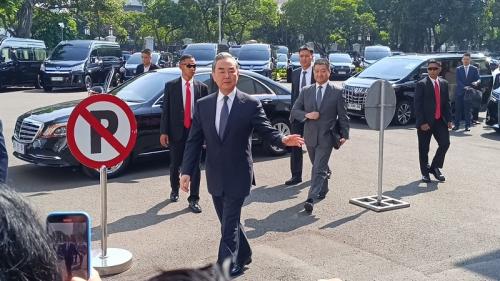 Wang Yi tiba sekitar pukul 09.23 WIB. Wang Yi nampak mengenakan setelan jas berwarna gelap.