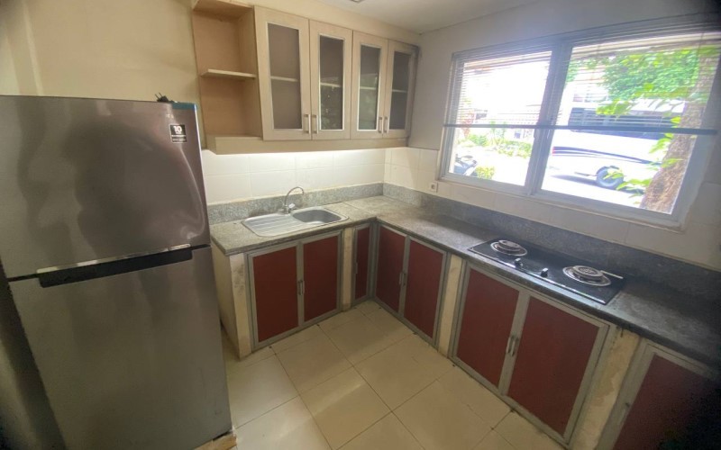 Untuk bagian dapur, sudah dilengkapi kitchen set putih dan satu unit kompor tanam dan kulkas. Namun, kompor itu terlihat sudah agak berkarat di bagian tungkunya.