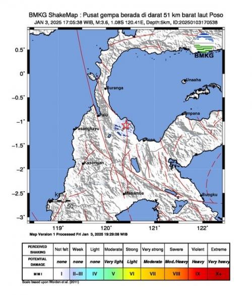 "Magnitudo 3,6, 03 Januari 2025 17:05:38 WIB, Lokasi 1.08 LS, 120.41 BT (Pusat gempa berada di darat 51 km barat laut Poso), Kedalaman: 5 Km," cuit laman X @infoBMKG.