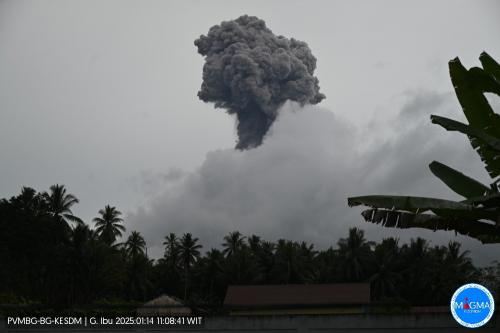 “Terjadi erupsi Gunung Ibu pada hari Selasa, 14 Januari 2025, pukul 11:07 WIT dengan tinggi kolom abu teramati ± 3.000 m di atas puncak (± 4.325 m di atas permukaan laut),” tulis keterangan resmi PVMBG, Selasa (14/1/2025).
