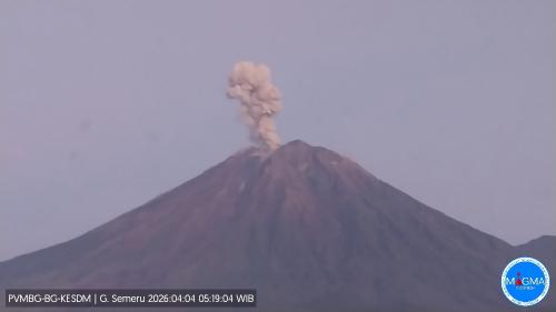 " Terjadi erupsi G. Semeru pada hari Sabtu, 04 April 2026, pukul 05:19 WIB dengan tinggi kolom abu teramati ± 1000 m di atas puncak (± 4676 m di atas permukaan laut). Kolom abu teramati berwarna putih hingga kelabu dengan intensitas sedang ke arah selatan," tulis PVMBG dalam keterangan tertulisnya.