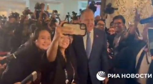 Setelah menunggu cukup lama, Lavrov akhinya mendekati para wartawan. Menariknya, dia juga melakukan foto selfie dengan pekerja media.