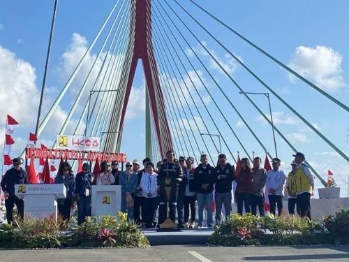 Sebelum peresmian, Jokowi terlebih dahulu menjajal jembatan tersebut dengan menggunakan sepeda motor. Dia pun mengenakan jaket bertuliskan Nusantara mengaku jalanan mulus dan nyaman.