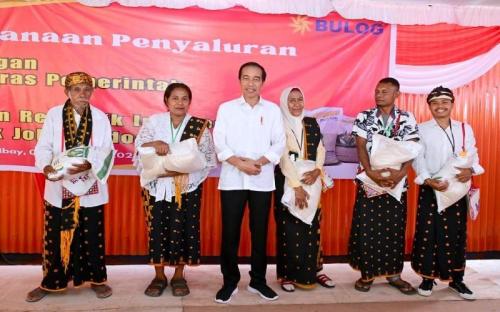 Dalam kunjungannya, Jokowi menyapa masyarakat serta membagikan bantuan pangan cadangan beras pemerintah (CBP) kepada sejumlah keluarga penerima manfaat (KPM) yang telah hadir di sana.
