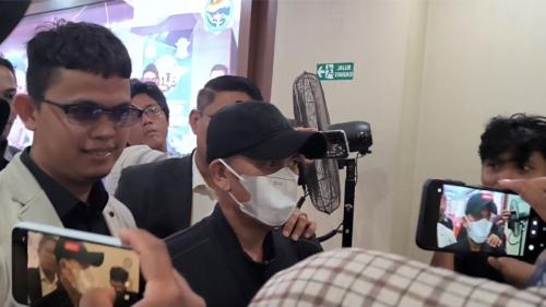 Terlihat Arsin memasukkan kedua tangganya ke jaket hitam yang dia gunakan, sambil terus berjalan menerobos kerumunan wartawan yang menunggunya.