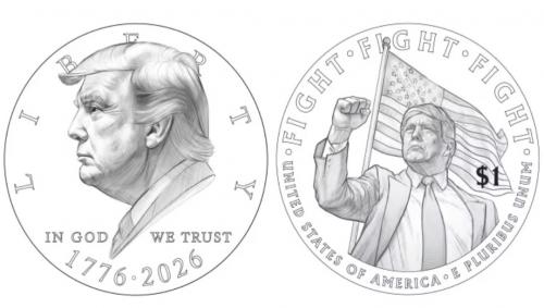 Draf gambar tersebut menunjukkan profil samping Trump di bagian depan dengan tulisan "Liberty" di bagian atas, "In God we Trust" di bagian bawah, dan tanggal 1776 dan 2026.