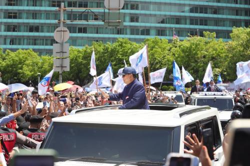 Pada momen itu, Prabowo berdiri dari dalam mobil putihnya dan disambut hangat para masyarakat yang melambaikan tangan untuknya. Dengan penuh senyuman, Prabowo menyapa rakyat yang juga menyanyikan yel-yel untuknya.