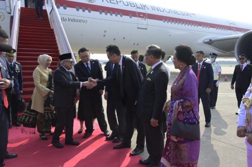 Saat Pesawat Garuda Indonesia (GIA-2) mendarat di China, Wapres disambut oleh Wakil Gubernur Provinsi Fujian Madame Guo Ningning, Duta Besar RI untuk China Djauhari Oratmangun beserta Ibu Sih Elsiwi Handayani Oratmangun, dan Atase Pertahanan (Athan) RI Beijing Kolonel Mar. Benny Poltak Nadeak beserta Ibu Desy Sulastri Tampubolon.