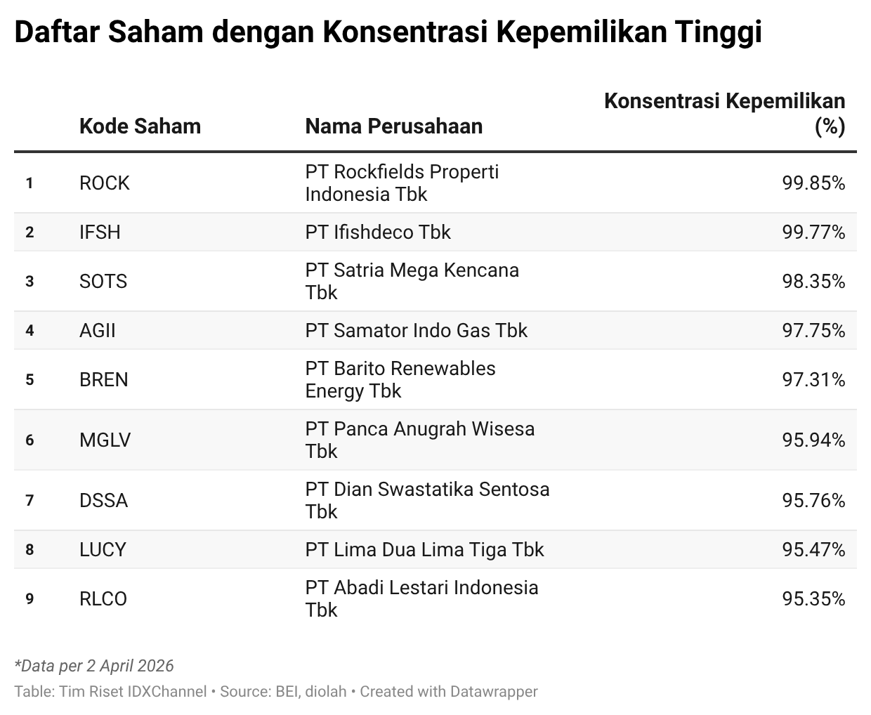 Dalam daftar tersebut, sejumlah emiten tercatat memiliki kepemilikan yang sangat terkonsentrasi.