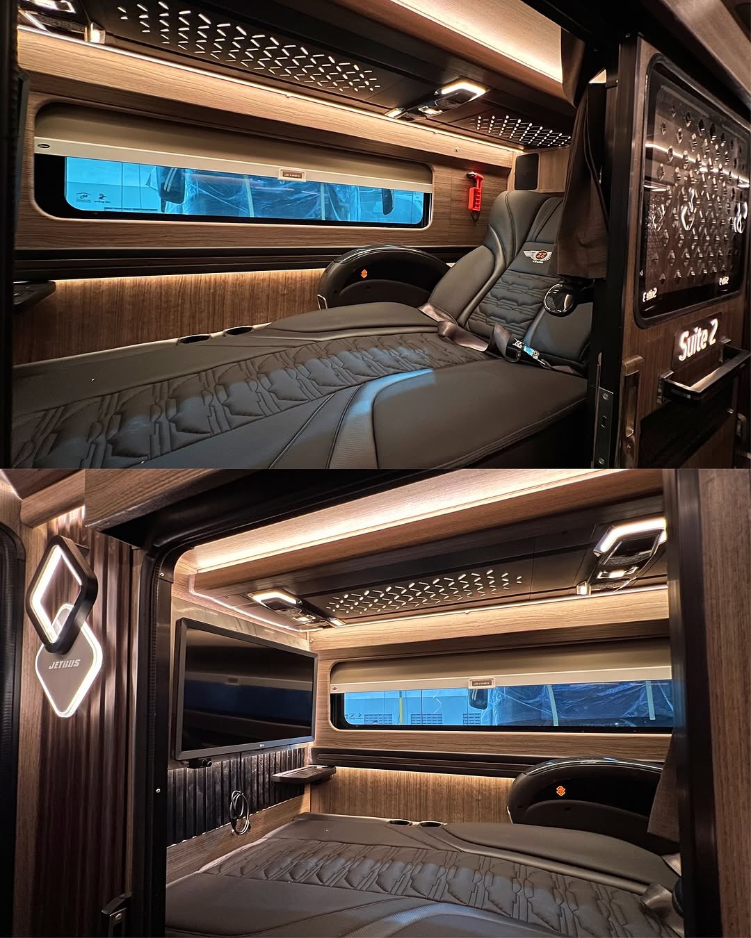 Masuk ke bagian dalam, pada kokpit pengemudi sudah dilengkapi layar head unit, serta layar pemantau kamera CCTV yang memperlihatkan area kabin dan sekitar luar bus. Interior bus ini terlihat elegan dengan pemilihan warna hitam pada kursi dan aksen kayu.