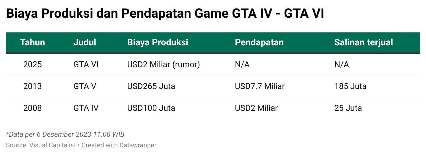 Para analis memperkirakan biaya pembuatan GTA VI alias GTA 6 yang akan dirilis mencapai USD2 miliar, termasuk biaya pemasaran dan lainnya. Dengan berlatar belakang "Vice City" yang terinspirasi dari Miami, grafis yang canggih, dan mesin game yang baru menjadi alasan mengapa game ini membutuhkan biaya yang sangat besar.