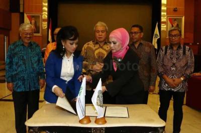 Wakil Ketua Umum Iwapi Bidang International Ira Sofwan (ketiga kiri), Ketua Dewanita Dewan Usahawan Bumiputera Serawak Hajah Juita Haji Drap (ketiga kanan) menunjukan nota perjanjian kerja sama didampingi (kiri-kanan) President Serawak Bumiputera Chamber of Enterpreneurs (DUBS) Datu Haji Halmi Bin Ikhwan, Chairman Sarawak Bussines Federation Datuk Abang Haji Abdul Karim Tun Datuk Abang Haji Openg, Deputy Chief Minister Of Serawak TB Datuk Amar Haji Awang Tengah Bin Ali Hasan, Direktur Investment Application Servis BKPM Husein Maulana dan Konsulat Jenderal Republik Indonesia di Kuching, Sarawak, Malaysia Yonny Tri Prayitno di Gedung BKPM, Jakarta, Kamis (25/10/2018).